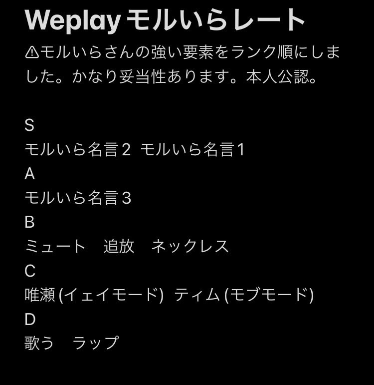 モルいらとは、WePlayの喧嘩民。ディベートレート、喧嘩レートなどを自主作成している。女たらし。