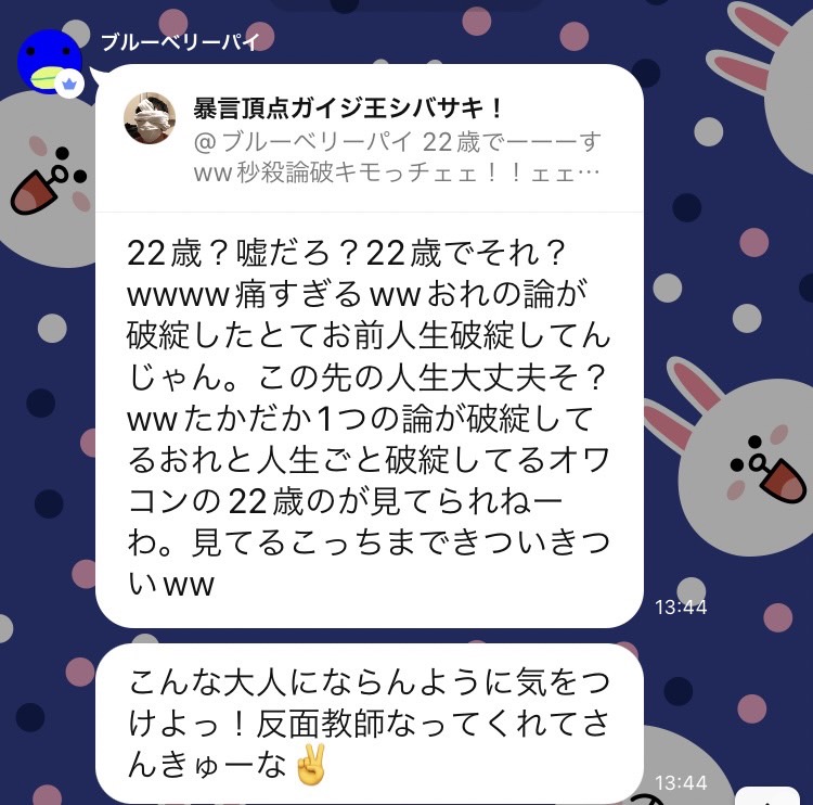 13:51 ブルーベリーパイ まじ?通えてんの?どこの大学のなんて名前のやつ?おれは論破綻しただけでなんで敗北者?人生破綻してる方が敗北者じゃね?あっ、人生が詰み過ぎてネットで論が破綻するかどうかを重視しちゃうんだ!かわいそ〜wwww